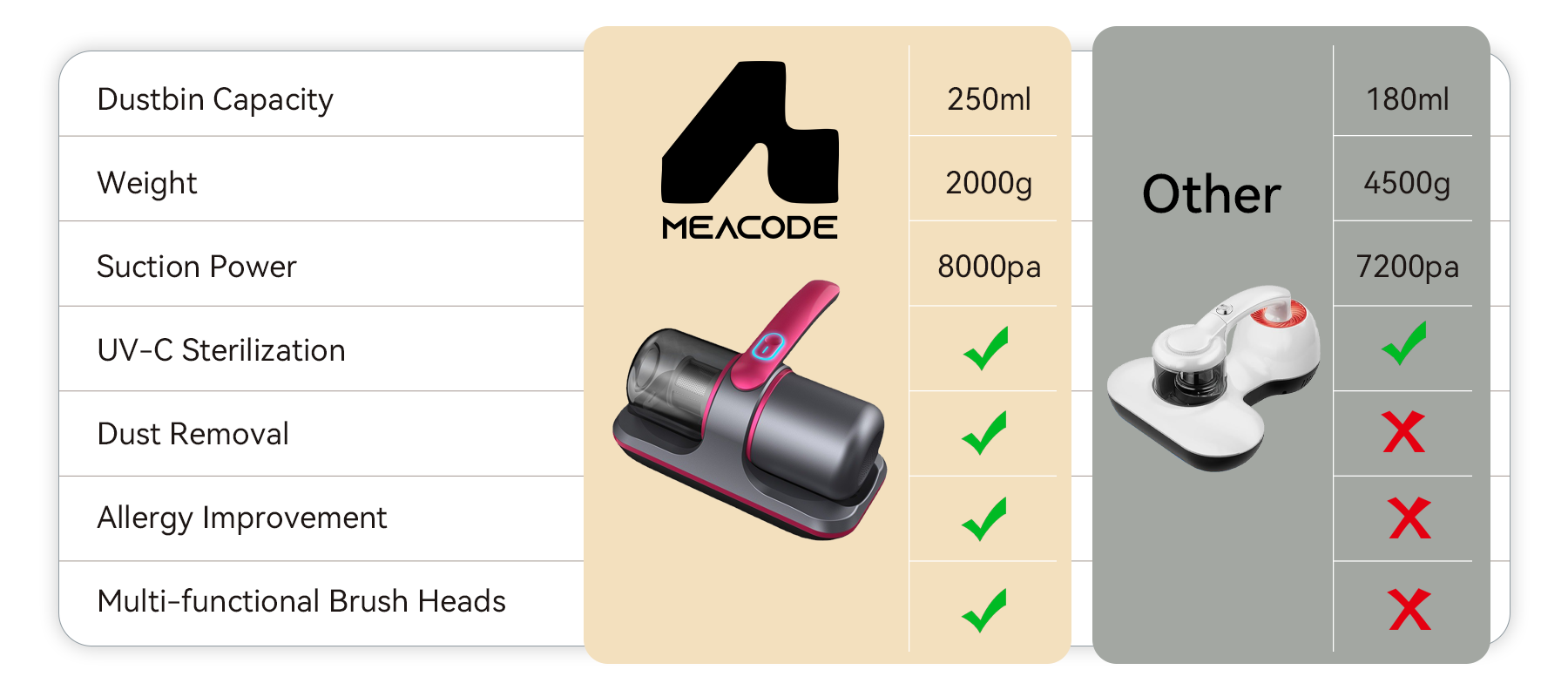 Meacode Mite-Removing UV Vacuum Cleaner:Experience unparalleled comfort and peace of mind. With a perfect fusion of innovative cleaning power and modern design, our vacuum elevates your daily life and interactions with a healthier, purer home.